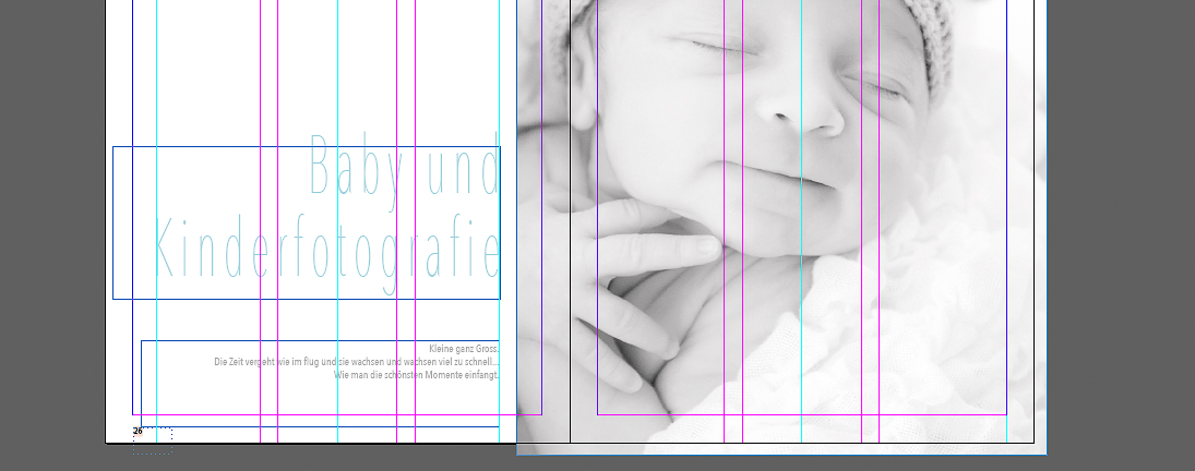 Auch immer eine super Hilfe sind die sogenannten „Hilfslinien“ (im Bild Pink und Türkis eingefärbt) diese kann man auf dem Dokument platzieren und sie helfen einem bei der Ausrichtung und Platzierung von Feldern und Texten. Durch unterschiedliches einfärben solcher Linien kann man sich unterschiedliche Einteilungen schaffen und mit nur einer Tastenkombi sind sie ausgeblendet und wieder eingeblendet.