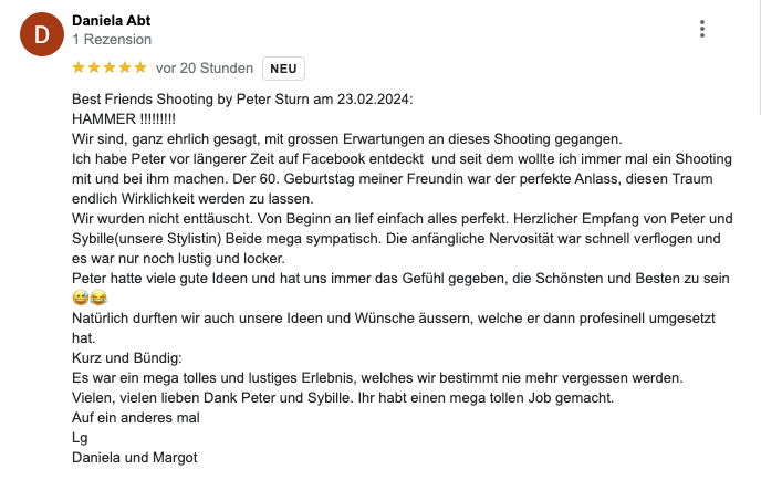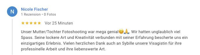 Ich fand es wirklich super ein super Team alle freundlich und nett und vorallem bin ich super zufrieden mit dem Shooting werde sicher wiedereinmal vorbei kommen. Lg