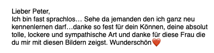 Ich wurde herzlich und liebevoll empfangen! Sofort hab ich mich total wohl gefühlt! Das Styling war super und Peter hat einen super Job gemacht! Die Bilder sind meeega super!Ich hab mich richtig gefreut! Ich komme bestimmt wieder!